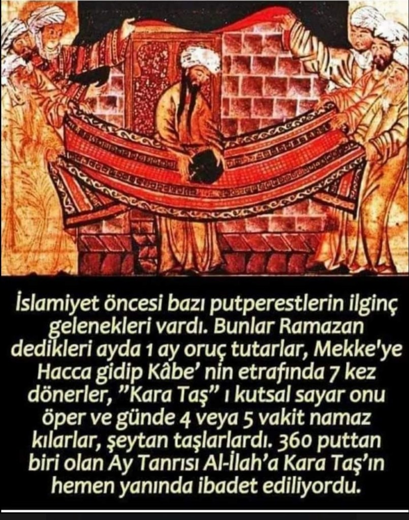 Is Allah the Same God as The God of Bible?, M. J. Afshari, p 6, 8-9, İslam, Beliefs And Observances,Islam öncesi putperest araplar: Ramazan dedikleri ayda bir ay oruç tutarlar, Mekke’ye Hacca gidip Kabe’nin etrafında yedi kez dönerler, “Kara Taş” ı (Hacerül Esved) kutsal sayar onu öper ve günde dört veya beş vakit namaz (salat) kılarlar, şeytan taşlarlardı. (Is Allah the Same God as The God of Bible?, M. J. Afshari, p 6, 8-9, İslam, Beliefs And Observances, Caesar E. Farah) Sabiilik, yıldız kültüne sahip bilinen en eski pagan dinidir. İlginçtir ki Sabiiler de 3 vakit namaz kılar ve 1 ay oruç tutarlardı. Farz orucun dışında nafile oruçlara da sahiptiler. (İbn Nedim, El Fihrist, s. 442-445)